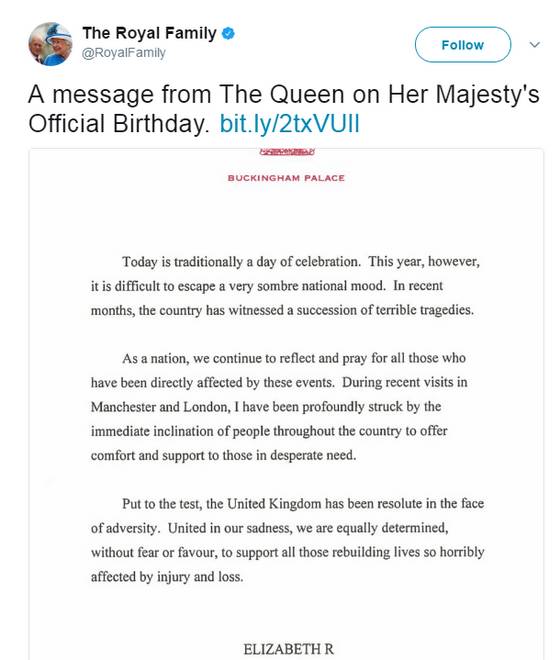 "ბრიტანეთი სევდიანმა განწყობამ მოიცვა", - განაცხადა დიდი ბრიტანეთის დედოფალმა ელისაბედ მეორემ ოფიციალურ დაბადების დღესთან დაკავშირებით გაკეთებულ მიმართვაში.