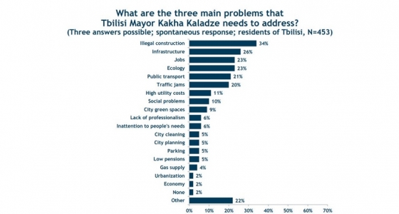 კვლევის მონაწილეებს სთხოვეს, დაესახელებინათ ის სამი მნიშვნელოვანი პრობლემა, რომლებსაც კახა კალაძემ ყურადღება უნდა მიაქციოს. უკანონო მშენებლობების გარდა გამოკითხულთა 26%-მა ინფრასტრუქტურა დაასახელა, 23%-23%-მა - სამუშაო ადგილები და ეკოლოგია, ხოლო 21%-მა - საზოგადოებრივი ტრასნპორტი.