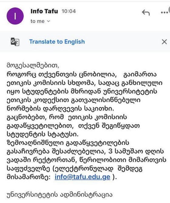 „როგორც თქვენთვის ცნობილია, გაიმართა ეთიკის კომისიის სხდომა, სადაც განხილული იყო სტუდენტების მხრიდან უნივერსიტეტის ეთიკის კოდექსით გათვალისწინებული ნორმების დარღვევის საკითხი. გაცნობებთ, რომ ეთიკის კომისიის გადაწყვეტილებით, თქვენ შეგიწყდათ სტუდენტის სტატუსი. ზემოაღნიშნული გადაწყვეტილების გასაჩივრება შესაძლებელია, 3 სამუშაო დღის ვადაში რექტორთან, წერილობითი მიმართვის საფუძველზე“, - წერია ინფორმაციაში.
