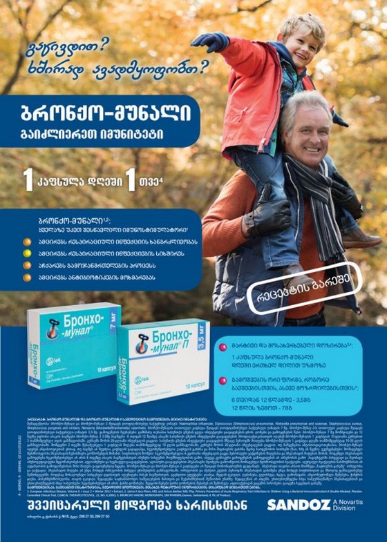 - ბოლო პერიოდში მეტ უპირატესობას ანიჭებენ საშუალებებს, რომლებიც აუმჯობესებენ იმუნური სისტემის მდგომარეობას და ზრდიან ორგანიზმის მედეგობას მწვავე რესპირაციული ინფექციების მიმართ. მსგავსი საშუალებების არჩევისას დიდი ყურადღება ექცევა მედიკამენტის მოქმედების მექანიზმს და რაც ძალიან მნიშვნელოვანია ხარისხს, რომელსაც მწარმოებელი კომპანიაა უზრუნველყოფს. აქედან გამომდინარე მინდა გამოვყო შვეიცარული კომპანია „სანდოზი“-ს პრეპარატი ბრონქო-მუნალი. ბრონქო-მუნალი დღესდღეობით ყველაზე კარგად შესწავლილი იმუნოსტიმულატორი გახლავთ, რომელსაც გააჩნია დადასტურებული ეფექტურობა და უსაფრთხოების მაღალი პროფილი, სწორედ ამიტომ ამ მედიკამენტისადმი სანდოობა მთელ მსოფლიოში მაღალია: სტატისტიკური მონაცემებით მსოფლიოში ბრონქო მუნალით ნამკურნალევი პაციენტების რიცხვი 60 მილიონზე მეტია2, 3.