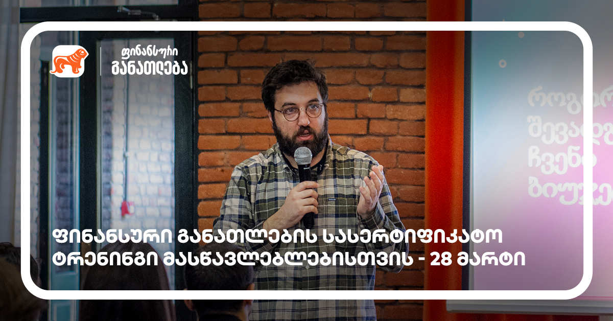 28 მარტს, 13:00 საათზე სკოლის მასწავლებლებისთვის ფინანსური განათლების სასერტიფიკატო კურსი ჩატარდება. ინიციატივის მხარდამჭერი საქართველოს ბანკია.